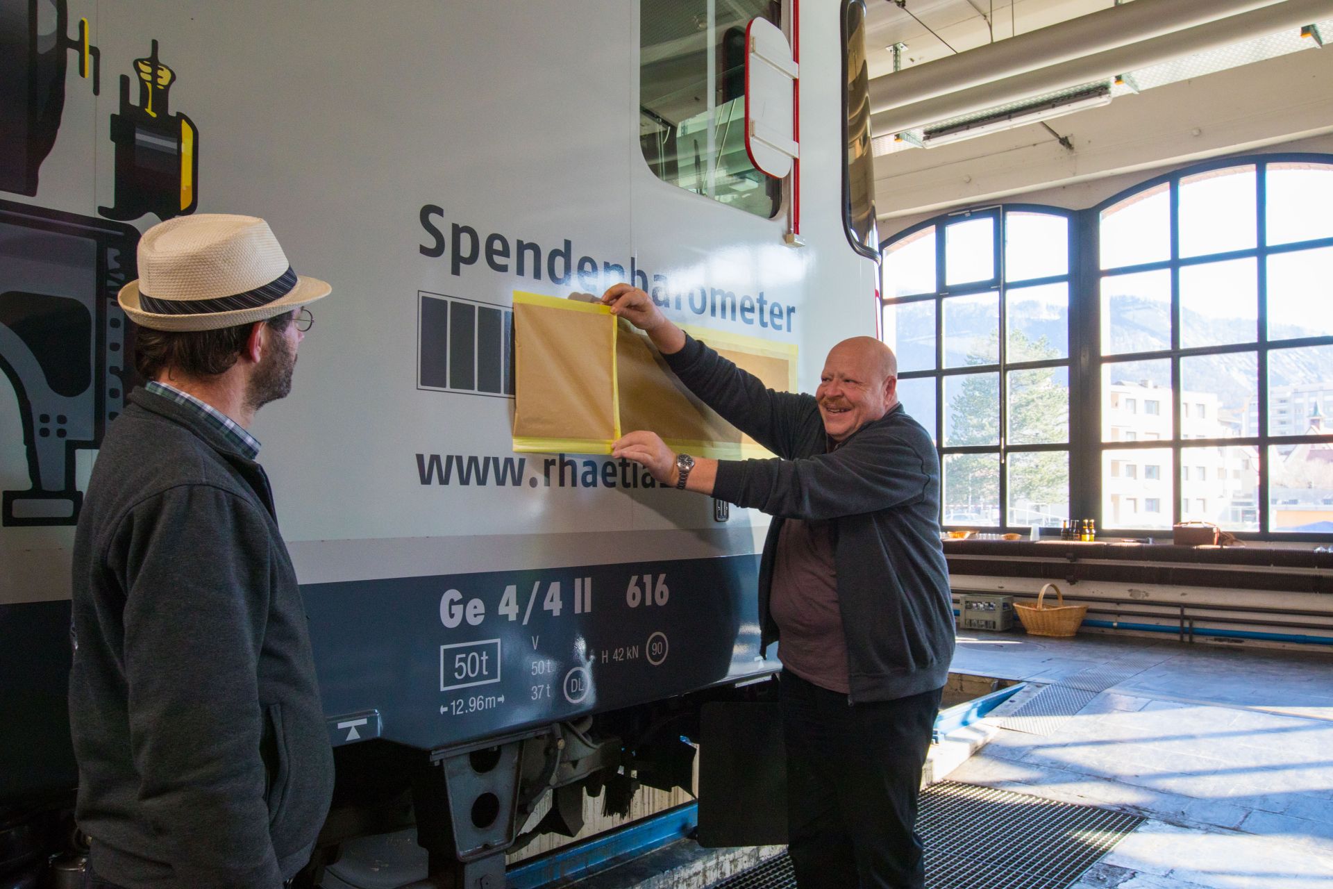 Die bestehenden drei Briketts wurden um vier ergänzt. Somit bildet der Spendenbarometer neu 350'000 Franken ab. Die Enthüllung wurde durch Thomas Gryzlak (ehemaliger Drogerieleiter aus Vaduz) vollzogen. Gryzlak ist der erste «Spendenchampion». Er hat in der Altjahrswoche 2018 an seinem ehemaligen Arbeitsort in der Drogerie APODRO in Vaduz rund 2'500.00 Franken für das Projekt RHÆTIA gesammelt. Die aktuell grösste Spende stammt von der Doris-Baeder-Gabriel-Stiftung aus dem Oberengadin.