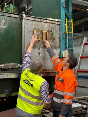 Ende November 2023 fand in Landquart eine erste "Anprobe" der neuen Schilder und der neu gegossenen Buchstaben (LD) statt. Anhand der alten, vorhandenen Bohrlöcher an der Führerstandwand sowie die Seitenwänden der Wasserkästen konnten die Positionen der Schilder genau eruiert werden.